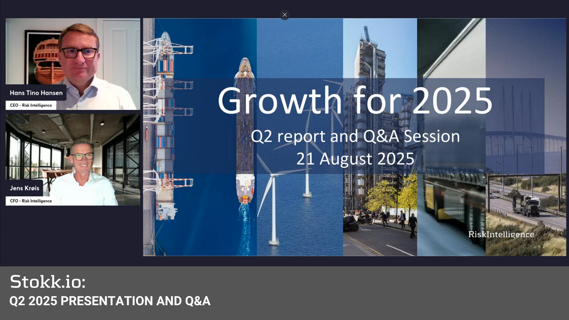 Risk Intelligence conducted a digital company presentation and Q&A session discussing the Q2 and Half-Year 2025 Interim Report. The online event took place on Thursday, 21 August 2025 at 15:00 CEST, via Stokk.io, and was hosted by the CEO and CFO of the company. The presentation covered key highlights form the report, followed by a Q&A session where the CEO and CFO addressed investor questions.